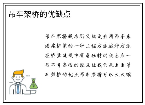 吊车架桥,顾名思义就是利用吊车来搭建桥梁的一种工程方法。这种方法在桥梁建设中有着独特的优点和一些不可忽视的缺点。金年会金字...